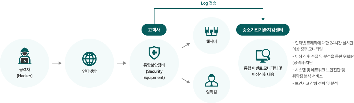 ※ 보안관제서비스는 중소기업내에 통합보안장비(UTM, IPS, 방화벽, IDS 등)가 설치되어야 서비스 연동 가능