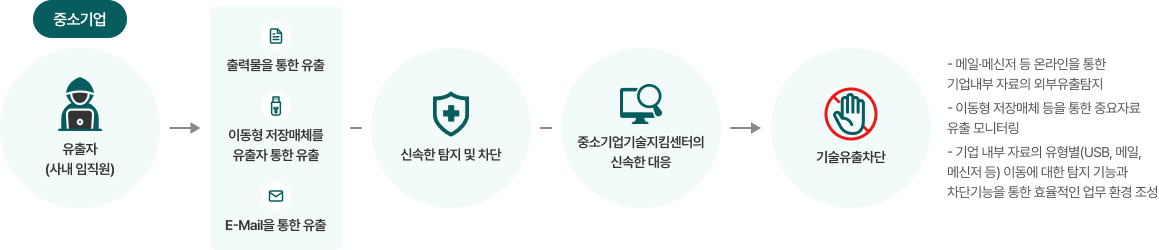 기업 내 중요문서가 내부 임직원에 의해 E-mail, 이동형저장매체(USB, HDD)를 통한 기술유출 시 중소기업기술지킴센터에서 24시간 실시간으로 탐지하여 대응해주는 서비스입니다.